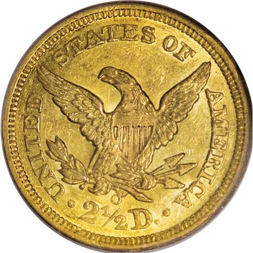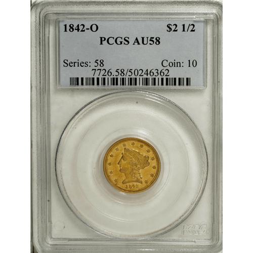 <B>1842-O $2 1/2 AU58 PCGS.</B></I> The 1842-O is one of the most elusive O-mints in any grade, and extremely so in AU or better condition. This coin's color is a superior and attractive mix of medium-gold and copper-gold. This highly lustrous example is well struck, even on the forecurl that trails down Liberty's neck, although examination with a loupe reveals a small scratch between stars 9 and 10. The reverse is boldly impressed, with excellent overall detailing on the eagle save on the left (facing) leg. The reverse is free of singularly mentionable marks. A stunning example of this rare branch mint coinage. Population: 6 in 58, 10 finer (3/07).<BR><BR><b>Shipping:</b> Coins & Currency (<a target="_blank" href="http://www.heritageauctions.com/common/shipping.php">view shipping information</a>)