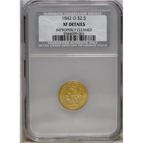 <B>1842-O $2 1/2 --Improperly Cleaned--NCS. XF Details.</B></I> A slightly bright example of this scarce issue, which has a production of just 19,800 pieces. Typically struck, but more presentable than the NCS designation implies.<BR><BR><b>Shipping:</b> Coins & Currency (<a target="_blank" href="http://www.heritageauctions.com/common/shipping.php">view shipping information</a>)