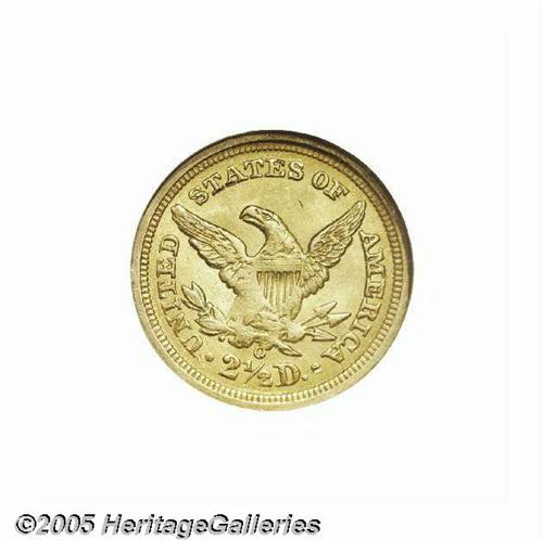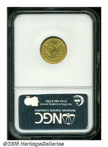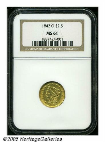 <B>1842-O<$2 1/2> MS61 NGC.</B></I> The 1842-O began with a modest mintage of only 19,800 pieces, lowest among quarter eagles from the New Orleans Mint. Only 65-70 coins are believed extant in all grades, the '42-O ranking second in overall rarity among O-mint quarter eagles, second only to the 1845-O. The '42-O is also a significant condition rarity, and Winter (1992) states that "the great majority of extant 1842-O Quarter Eagles grade Very Fine." Over the past several years a number of previously unrecorded Mint State coins have been certified, with a total of 22 pieces certified today in MS60-64 grades. Of course, this figure is somewhat inflated by inevitable resubmissions, so the actual number of Uncirculated pieces is probably more on the order of 12-14 coins. This example is tied with several others at the lower end of the Condition Census. The 1842-O is a notoriously weakly struck issue, and this piece also shows soft details on most of the obverse stars, Liberty's hair, and the eagle's left (facing) leg. The surfaces are golden-orange in color with soft, satin-like mint luster. The only mark of note (for pedigree purposes) is a short, angling nick in the field below the O in OF on reverse. An impressive example of this widely recognized O-mint rarity. Population: 4 in 61, 6 finer (6/05).