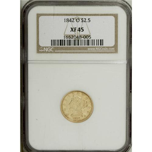 <B>1842-O $2 1/2 XF45 NGC.</B></I> A softly struck quarter eagle that has its share of remaining luster, particularly across the reverse peripheral legends. A mere 19,800 pieces were struck.<BR><BR><b>Shipping:</b> Coins & Currency (<a target="_blank" href="http://www.heritageauctions.com/common/shipping.php">view shipping information</a>)