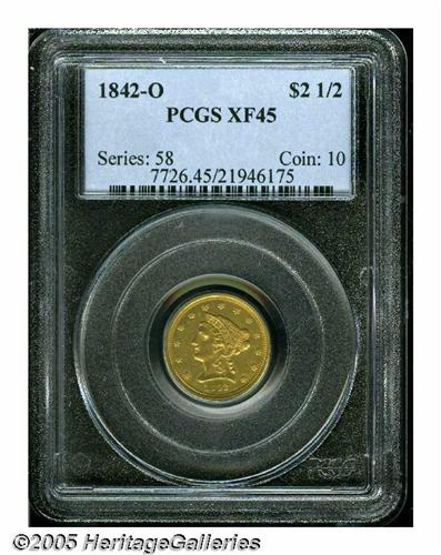 <B>1842-O<$2 1/2> XF45 PCGS.</B></I> Appealing even brown-gold surfaces and no serious imperfections. Survivors from this issue are elusive. Population: 11 in 45, 26 finer (6/05).