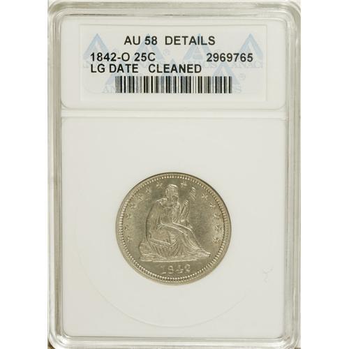 <B>1842-O 25C Large Date--Cleaned--ANACS. AU58 Details.</B></I> NGC Census: (8/6). PCGS Population (4/18). Mintage: 769,000. Numismedia Wsl. Price for NGC/PCGS coin in AU58: $775. (#5402)<BR><BR><b>Shipping:</b> Coins & Currency (<a target="_blank" href="http://www.heritageauctions.com/common/shipping.php">view shipping information</a>)