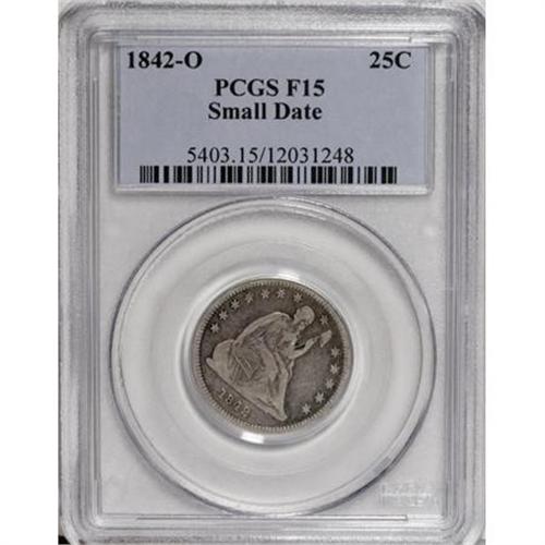 <B>1842-O 25C Small Date Fine 15 PCGS.</B></I> Briggs-1A, R.5, the only Small Date dies. A famous rarity within the Seated quarter series. 95% of LIBERTY is sharp, and all dentils are clear. The unmarked surfaces are primarily cream-gray with deeper toning at the margins. Population: 2 in 15, 17 finer (12/07).<BR><BR><B>Coin Engraver:</B> Christian Gobrecht<BR><BR><b>Shipping:</b> Coins & Currency (<a target="_blank" href="http://www.heritageauctions.com/common/shipping.php">view shipping information</a>)