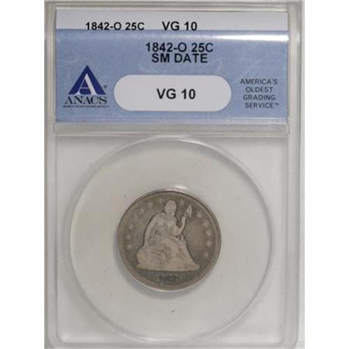 <B>1842-O 25C Small Date VG10 ANACS.</B></I> Larry Briggs rates the 1842-O Small Date quarter R.5. This Choice VG example displays light gray surfaces blushed with light blue. BER is strong, while I and TY partly show. Both sides are relatively clean.<BR><I>From The John Stimson, Sr. Collection, Part Two.</B></I><BR><BR><B>Coin Engraver:</B> Christian Gobrecht<BR><BR><b>Shipping:</b> Coins & Currency (<a target="_blank" href="http://www.heritageauctions.com/common/shipping.php">view shipping information</a>)