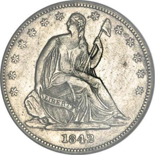 <B>1842-O 50C Small Date, Small Letters--Scratched, Cleaned--ANACS. XF45 Details.</B></I> WB-101. Wiley-Bugert list this rare variety as High R.4 overall, and High R.6 in XF or finer. The present slate-gray piece is sharper than most WB-101 survivors, but it has been abrasively cleaned and has a spot between HALF and DOL.<BR><I>Ex: Sussex Collection (Bowers and Merena, 11/90), lot 642.</B></I><BR><I>From The John Stimson, Sr. Collection, Part Two.</B></I><BR><BR><B>Coin Engraver:</B> Christian Gobrecht<BR><BR><b>Shipping:</b> Coins & Currency (<a target="_blank" href="http://www.heritageauctions.com/common/shipping.php">view shipping information</a>)