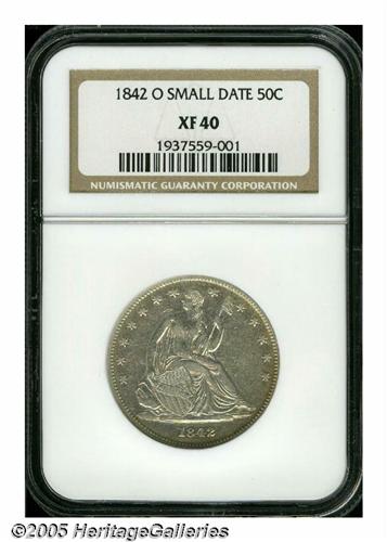 <B>1842-O<50C> Small Date, Small Letters XF40 NGC.</B></I> Several times scarcer than its 1842-O Medium Date, Large Letters counterpart, the Small Date has a low emission of 203,000 pieces and difficult to locate in all grades. Light golden-brown color graces the obverse margin. Glimpses of luster glimmer from the legends and inner devices. A subdued handling mark above the TAT in STATES is barely worthy of individual mention.<BR><I>From The Empire State Collection.</B></I>