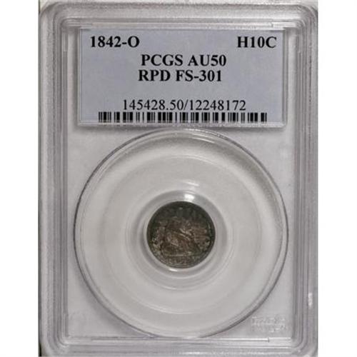<B>1842-O H10C --Repunched Date--PCGS.</B></I> FS-301. PCGS Population (1/15). NGC Census: (2/16). Mintage: 350,000. (#4331)<BR><I>From The Al Blythe Collection of Half Dimes.</B></I><BR><BR><B>Coin Engraver:</B> Christian Gobrecht<BR><BR><b>Shipping:</b> Coins & Currency (<a target="_blank" href="http://www.heritageauctions.com/common/shipping.php">view shipping information</a>)