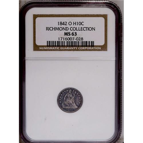 <B>1842-O<H10C> MS63 NGC.</B></I> Scarce in all grades, the 1842-O rates along with several other Stars Obverse O-mints in mint state rarity, exceeded only by the 1840-O, 1844-O, 1853-O No Arrows, and, of course, the low mintage 1846 from Philadelphia. The reflective fields are enhanced with a mottled coating of steel-blue toning and the strike is unusually sharp for this often-weak issue. Just a few minor field marks on each side serve to limit the grade.