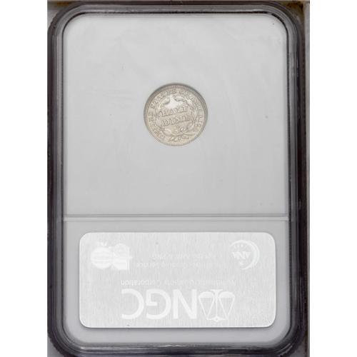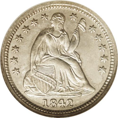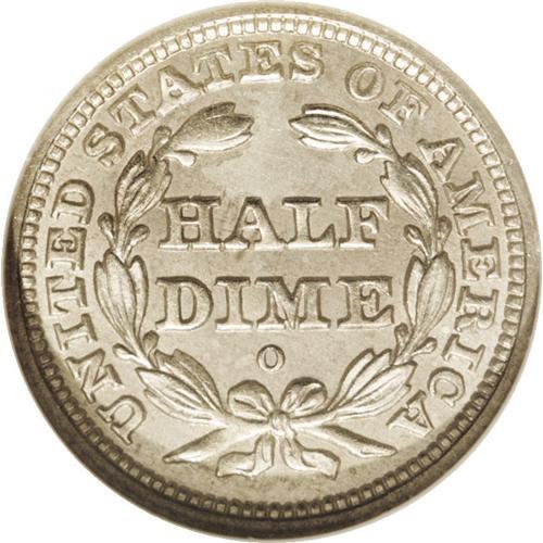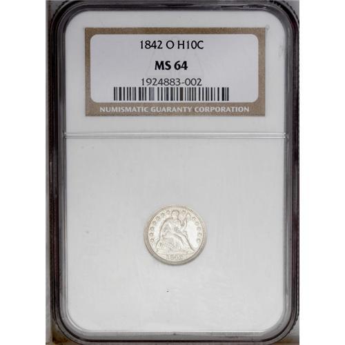 <B>1842-O<H10C> MS64 NGC.</B></I> Since the half dime specialist would be pleased to locate an 1842-O in well worn condition, the present example should attract significant bidder attention. Small areas of milky coloration are scattered over the otherwise silver-gray surfaces. There are a couple of minor abrasions that are worthy of mention in the right obverse field. While not complete, the strike is well above par for a product of the early New Orleans Mint. One of a mere 350,000 pieces produced, and an issue that is seldom offered in Mint State. Census: 2 in 64, 3 finer (1/06).