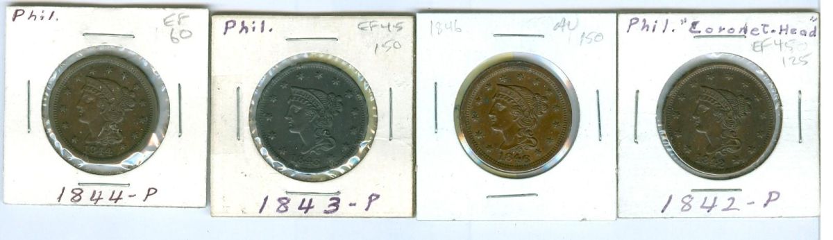 1842-P, 1843-P, 1844-P & 1846 1¢. Lot fo 4 coins avg EF in grades.