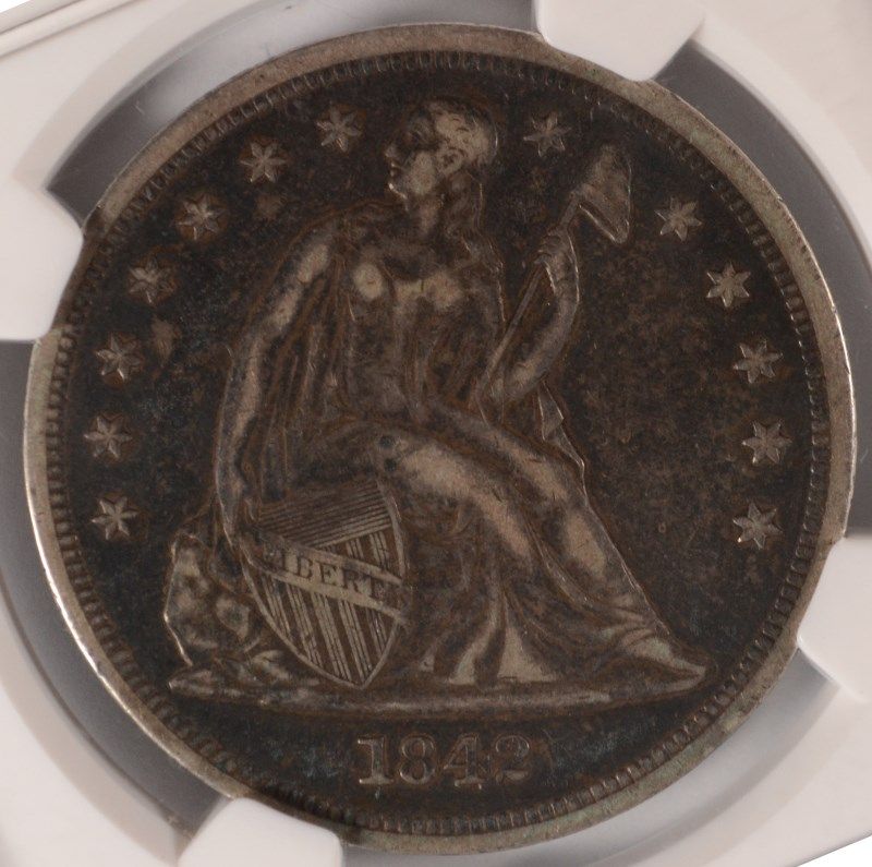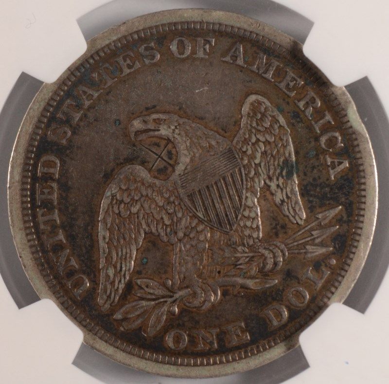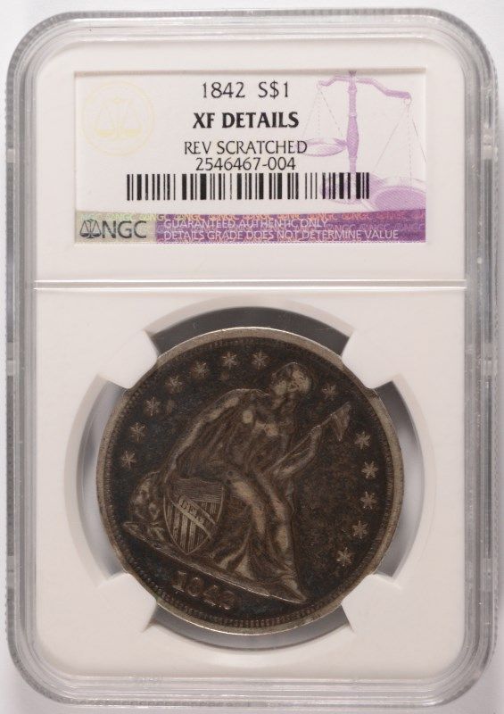 1842-P SEATED DOLLAR, NGC XF DETAILS, REV SCRATCHED