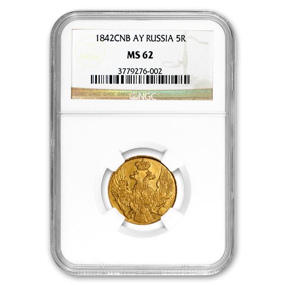 One piece 1842 Russia Gold 5 Roubles Nicholas I MS-62 NGC