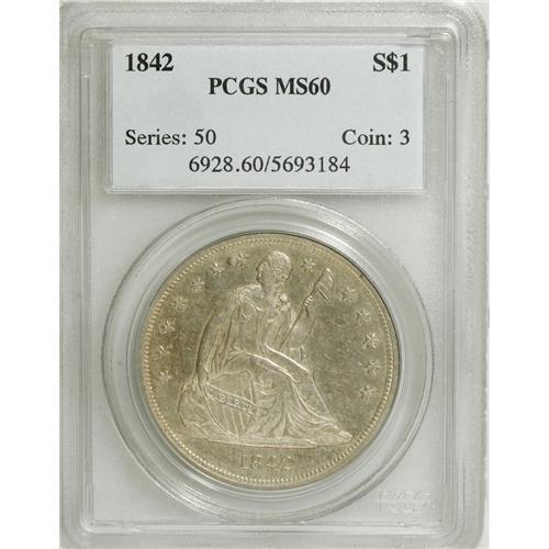 <B>1842 S$1 MS60 PCGS.</B></I> Bowers' "Blundered Date" variety. The date is lightly repunched, most plainly on the base of the 2 and within the upper inner loops of the 8. The base of a probable 2 is incorrectly punched into the rock. A nicely struck and rather prooflike example that has olive patina and a few wispy field marks. Population: 3 in 60, 70 finer (2/07).<BR><BR><b>Shipping:</b> Coins & Currency (<a target="_blank" href="http://www.heritageauctions.com/common/shipping.php">view shipping information</a>)