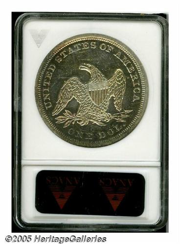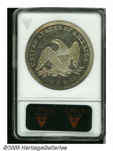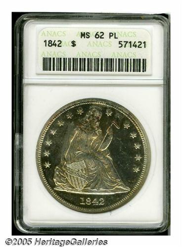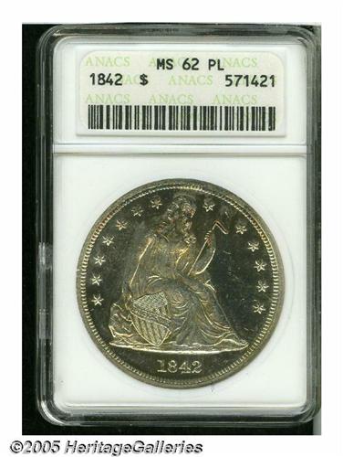 <B>1842<S$1> MS62 Prooflike ANACS.</B></I> All Mint State Seated Dollars are scarce or rare, including the so-called hoard dates of 1859-O and 1860-O. Only occasionally are these silver dollars found with prooflike surfaces, as seen on this Mint State 1842 dollar. The surfaces are mostly brilliant and lightly abraded with noticeable contrast between the fields and the devices. The upper obverse and much of the reverse are graced by attractive light gold and iridescent toning.