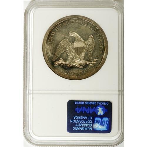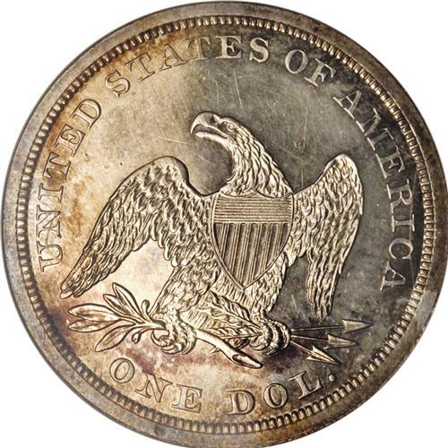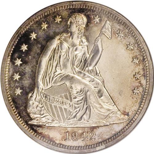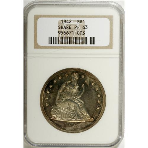 <B>1842 S$1 PR63 NGC.</B></I> Ex: Share Collection. Proof Seated dollars from 1842 are certainly more frequently seen than the previous year's proof dollars and are only marginally more available than the 1840 issue. However, the absolute rarity of the 1842 proof dollar is best exhibited by the estimates of survivors given by experts who have studied this fascinating series. David Akers (in his catalog of the Pittman Collection) suggested a population of 10-12 coins, while Bowers estimated 7-14 examples are extant as recognizable proofs.<BR> All 1842 proofs, and most business strikes of this date, were struck from a single pair of dies. The main diagnostics of these coins include: horizontal die file marks around Liberty's left (facing) hand and a cluster of near-vertical ones at the crook in Liberty's right (facing) arm on each side of the pole. The reverse die is that which Breen describes as the reverse of 1842-1852; Bowers calls it the reverse of 1840-1850. Since most business strikes and all proofs were struck from this obverse die, the characteristics of the reverse die are all the more important if one has any doubt about the status of an 1842 dollar. The primary characteristics of this reverse die include: <BR><BR> 1. Two defects, joined, appear as projections on the right side of the final A in AMERICA.<BR> 2. Each of the three elements in the vertical shield stripes extend into the crossbars with the sole exception of the final element in stripe 4.<BR> 3. The final element of stripe 1 extends to crossbar 3.<BR><BR> The fields on each side display deep reflectivity that could only be found on proof coinage. The surfaces are bright with evidence of light hairlines, which account for the grade. There are three small planchet flaws on Liberty's neck, and a semi-circular planchet lamination in the lower right obverse field--both of which will serve as useful pedigree identifiers for some future cataloger/researcher. The centers are generally free from color with rich russet and cobalt-blue toning scattered around the margins. Census: 3 in 63, 3 finer (11/06).<BR><BR><b>Shipping:</b> Coin/Currency (<a target="_blank" href="http://www.heritageauctions.com/common/shipping.php">view shipping information</a>)
