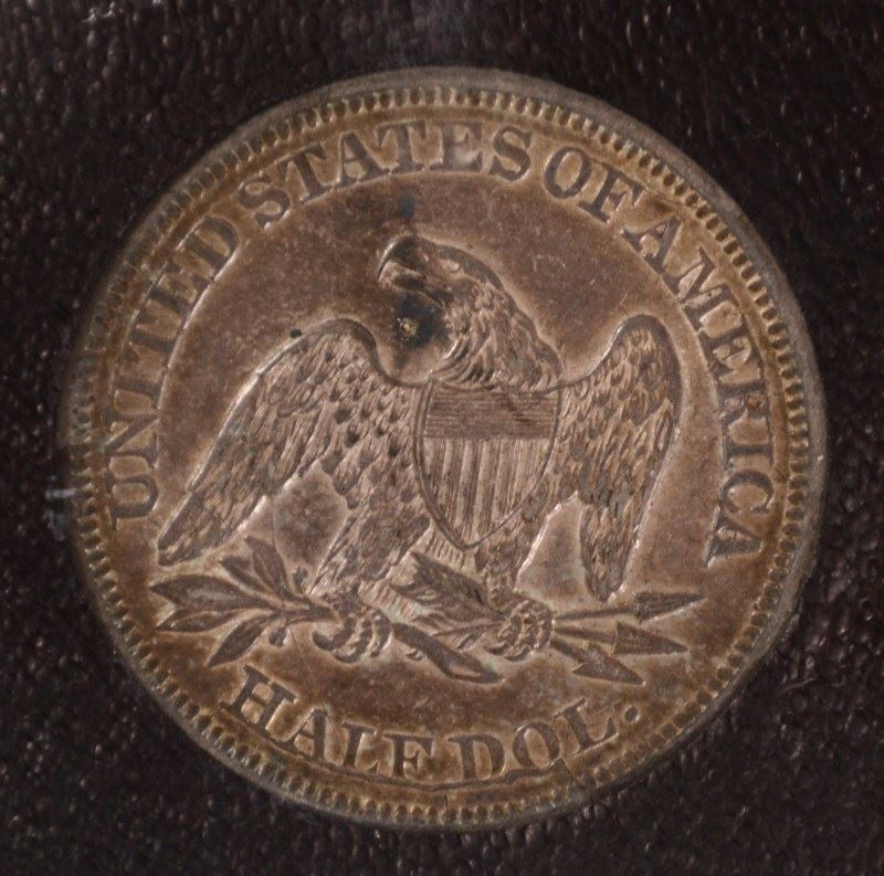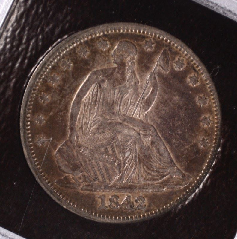 1842 SEATED HALF DOLLAR, AU-53 NICE ORIGINAL COIN, DATE IS TRIPLE PUNCHED