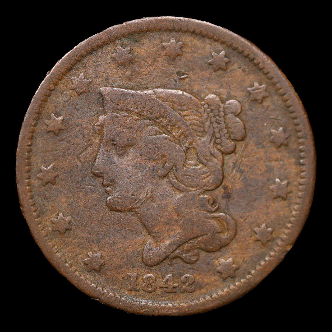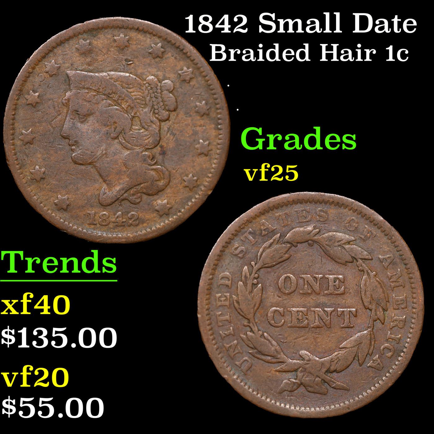 1842 Small Date Braided Hair Large Cent 1c Grades vf+. 0