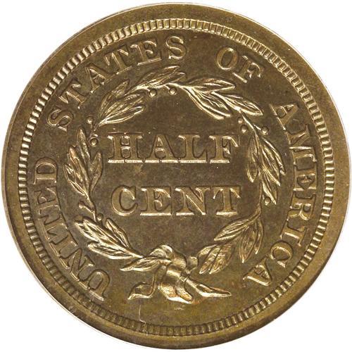 <B>1843<1/2 C> Original PR65 Brown PCGS.</B></I> B-1a, R.6. A lovely Gem proof example of the Original variety, actually struck in 1843 and identified by large berries in the wreath. Approximately 20 examples of this variety are known today. This sharply struck specimen has fully reflective fields and light cameo contrast. Light brown surfaces are accented by gold, tan, and pale blue color. The obverse has a few darker toning spots (non-corrosive) that may assist in pedigree determination. One of these is at the back of Liberty's mouth, and another is in the field above the bust tip. Highly desirable and attractive. EAC PR60.