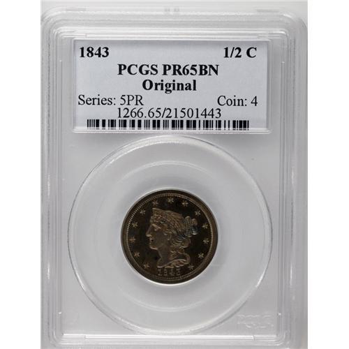 1843 1/2 C Original PR65 Brown PCGS. B-1a, R.6. A love