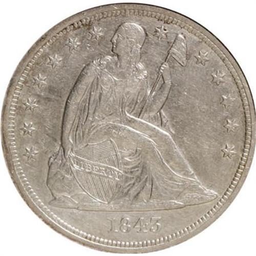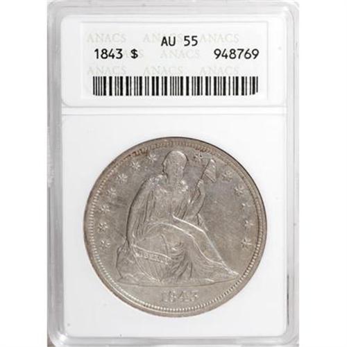 <B>1843 $1 AU55 ANACS.</B></I> NGC Census: (49/102). PCGS Population (38/74). Mintage: 165,100. Numismedia Wsl. Price for NGC/PCGS coin in AU55: $780. (#6929)<BR><BR><B>Coin Engraver:</B> Christian Gobrecht<BR><BR><b>Shipping:</b> Coins & Currency (<a target="_blank" href="http://www.heritageauctions.com/common/shipping.php">view shipping information</a>)
