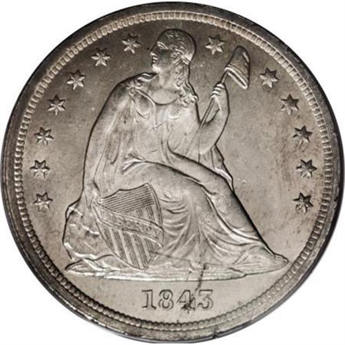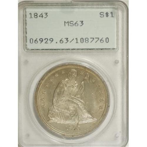<B>1843 $1 MS63 PCGS.</B></I> A lustrous and lightly toned piece with impressively bagmark-free fields. Although No Motto Seated dollars are collectible in collectible in MS60 to MS62 grades, these are usually 1859-O and 1860-O, and have reduced eye appeal from heavy marks. In comparison, the present lot has superior eye appeal. Certified in a first generation holder. Population: 11 in 63, 4 finer (5/07).<BR><BR><b>Shipping:</b> Coins & Currency (<a target="_blank" href="http://www.heritageauctions.com/common/shipping.php">view shipping information</a>)