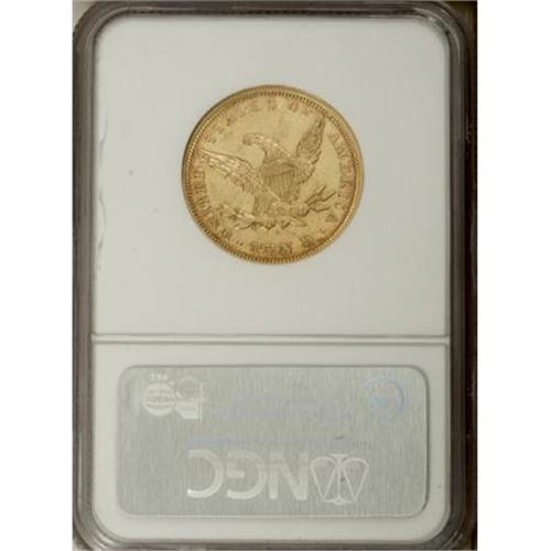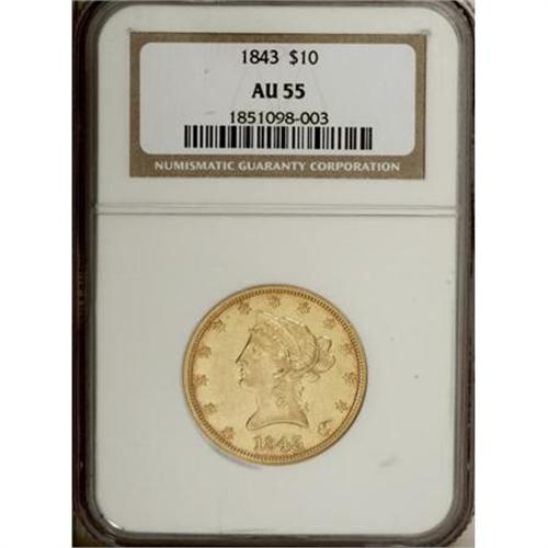 <B>1843 $10 AU55 NGC.</B></I> Breen-6861, "Very rare." Breen's tripled date variety. A modestly circulated early Gobrecht eagle, coined when that denomination was the largest-produced by the United States. This still-lustrous representative is well struck and has glints of orange against butter-yellow surfaces. Minimally abraded for the grade assigned. Census: 23 in 55, 17 finer (12/07). <BR><BR><B>Coin Engraver:</B> Christian Gobrecht<BR><BR><b>Shipping:</b> Coins & Currency (<a target="_blank" href="http://www.heritageauctions.com/common/shipping.php">view shipping information</a>)
