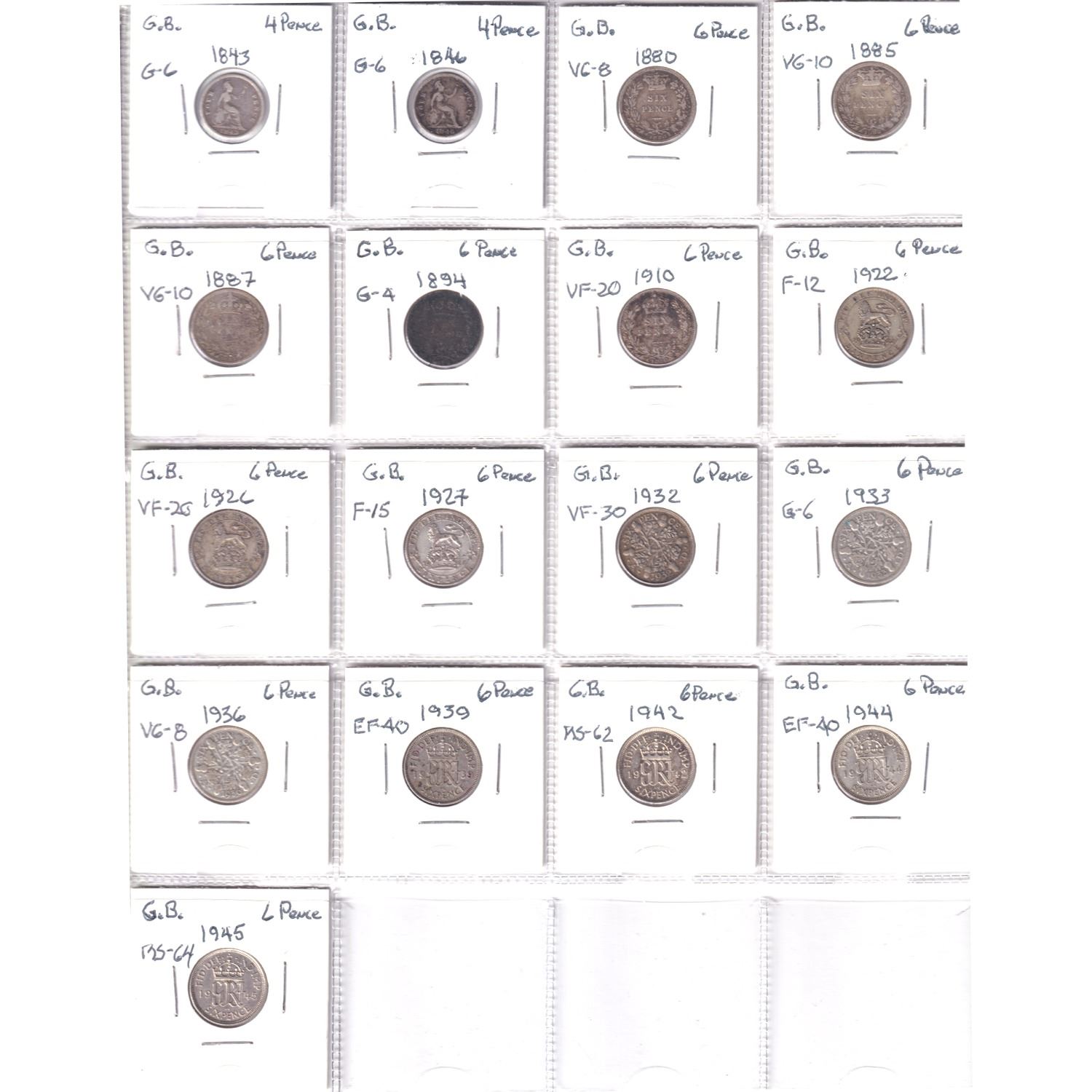 1843-1944 Great Britain 4 Pence & 6-Pence coins appear to range in grade from Good to MS. Lot includes : 1843 4-pence, 1846 4-pence and 1887-1945 F 6 Pence. Please view scan for details. 17pcs