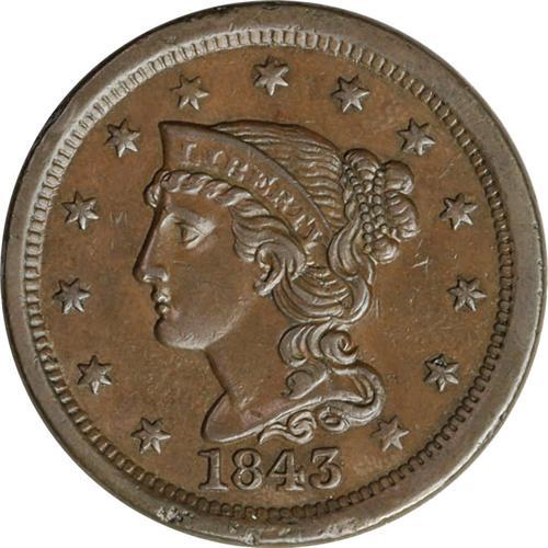 1843 1C Mature Head, Large Letters MS62 Brown NGC. N-1 1843[1C] Mature Head, Large Letters. N-16, R.