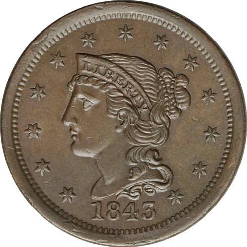 1843 1C Mature Head, Large Letters MS63 Brown NGC. N-5 1843[1C] Mature Head, Large Letters. N-5, R.1