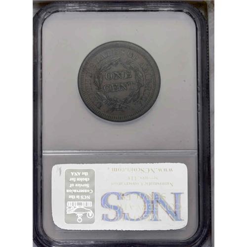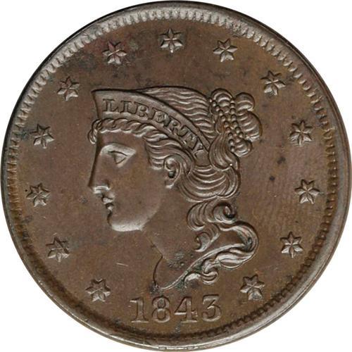 <B>1843<1C> Petite Head, Large Letters. N-4, R.1--Corrosion Spots--NCS. Unc. Details. AU55 EAC.</B></I> Grellman state c. Glimpses of dark verdigris are observed on the bust truncation, star six, and the inner wreath above the N in ONE. A couple of short marks precede the U in UNITED, and a light fingerprint is noted between stars 11 and 12. This well struck medium brown piece features a rim cud beneath the 1 in the date, a later die state than the prior lot. Envelope Included.