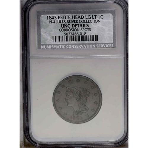 1843 1C Petite Head, Large Letters--Corrosion Spots--N 1843[1C] Petite Head, Large Letters. N-4, R.1