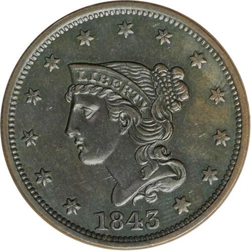 1843 1C Petite Head, Small Letters MS62 Brown NGC. N-1 1843[1C] Petite Head, Small Letters. N-12, R.