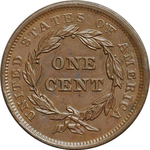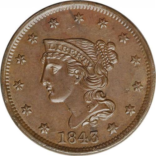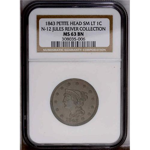 1843 1C Petite Head, Small Letters MS63 Brown NGC. N-1 1843[1C] Petite Head, Small Letters. N-12, R.