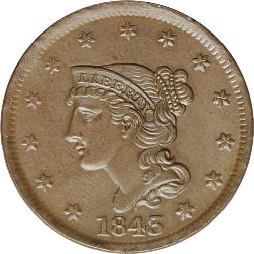 <B>1843<1C> Petite Head, Small Letters. N-10, R.3. MS65 Brown NGC. AU55 EAC.</B></I> Grellman state b. A suitably struck and glossy golden-brown beauty. The reverse is nearly void of contact, and neither side possesses detectable carbon. Small marks above and below the NE in ONE and below the E in CENT determine the grade. Flowlines in the field near the profile and AMERICA exemplify later dies. The Petite Head and Mature Head are relatively similar, the coronet tip is near star 5 for the Petite Head, the Mature Head is larger and has the coronet tip centered between stars 5 and 6.<BR><I>Ex: R.E. Naftzger, Jr.; Willard C. Blaisdell (9/1976); Del Bland (6/30/1977).</B></I> Envelope Included.