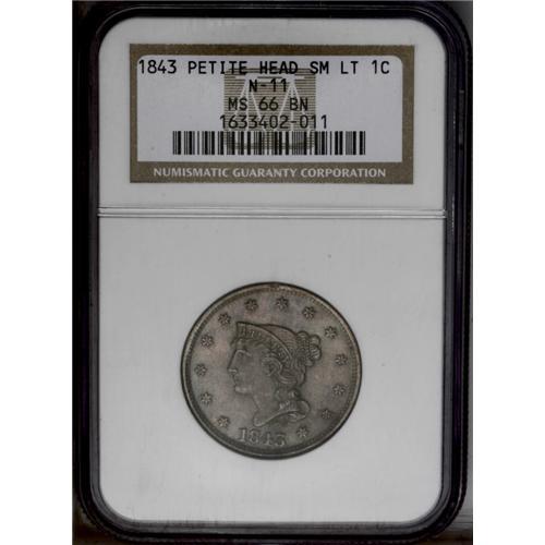 1843 1C Petite Head, Small Letters MS66 Brown NGC. N-