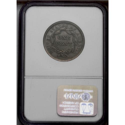<B>1843<1C> Petite Head, Small Letters MS66 Brown NGC.</B></I> N-11, Low R.2. A middle to late die state that has a thin die crack (as made) extending from 4 o'clock on the reverse rim through the I in AMERICA to the wreath (this diagnostic crack extends to the rim at 10 o'clock in the latest die state). A well struck Gem with good luster and deep chocolate-brown patina. A small mint-made planchet flaw is noted on the obverse rim at 12 o'clock. EAC 60+.
