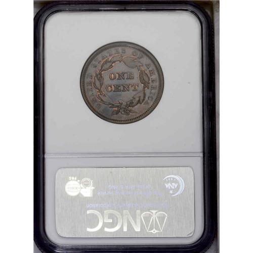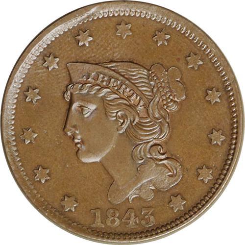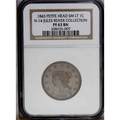 <B>1843<1C> Petite Head, Small Letters. N-14, High R.6. PR63 Brown NGC. PR63 EAC.</B></I> Fortunately, the N-14 die marriage is known only in Proof quality, for otherwise, it would be difficult to make such a determination. Reflective light olive surfaces with a strip of darker steel-brown color on the reverse. Traces of bright orange mint color adhere to the protected areas around the devices, especially on the reverse. Exceptionally blunt with the date, stars, hair buns, and leaves on the reverse all nearly flat, without any detail.<BR><I>Ex: Lester Merkin (3/1968), lot 189; New England Rare Coin Auctions (11/1975), lot 398; Denis W. Loring; Robinson S. Brown, Jr. (Superior, 10/1986), lot 971.</B></I> Envelope Included.