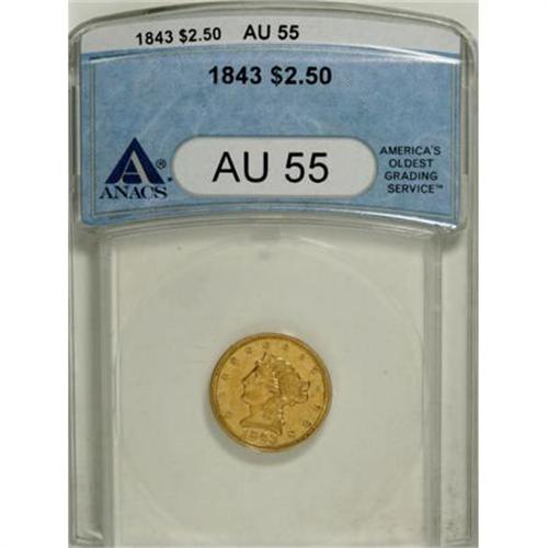 <B>1843 $2 1/2 AU55 ANACS.</B></I> Peach-gold surfaces retain luster in the recesses, and a well directed strike has left sharp definition on the design elements of this Choice AU quarter eagle. A few minor marks scattered about are not detracting. A challenging issue in this grade, and a true rarity in Mint State. <BR><BR><B>Coin Engraver:</B> Christian Gobrecht<BR><BR><b>Shipping:</b> Coins & Currency (<a target="_blank" href="http://www.heritageauctions.com/common/shipping.php">view shipping information</a>)
