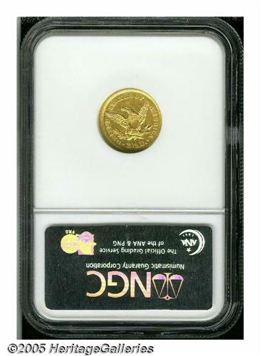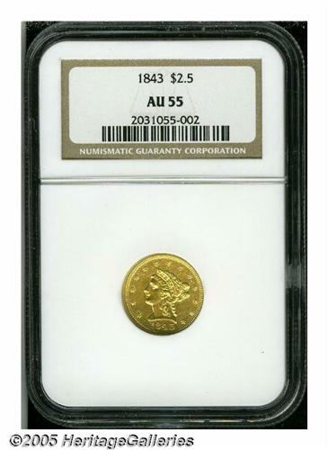 <B>1843<$2 1/2> AU55 NGC.</B></I> Scarcer than its mintage of 100,546 pieces would suggest, the 1843 is a condition rarity in and near mint state. This specimen has nice remaining definition, except that the eagle's right leg is weak, and the yellow-gold surfaces display luster in the protected areas. Some small abrasions are noted on Liberty's chin. Population: 17 in 55, 41 finer (3/05).