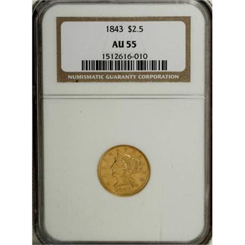 <B>1843 $2 1/2 AU55 NGC.</B></I> NGC Census: (29/66). PCGS Population (6/16). Mintage: 100,546. Numismedia Wsl. Price for NGC/PCGS coin in AU55: $483. (#7727)<BR><BR><B>Coin Engraver:</B> Christian Gobrecht<BR><BR><b>Shipping:</b> Coins & Currency (<a target="_blank" href="http://www.heritageauctions.com/common/shipping.php">view shipping information</a>)