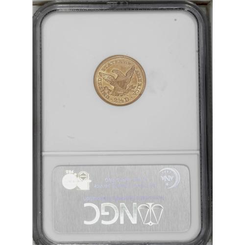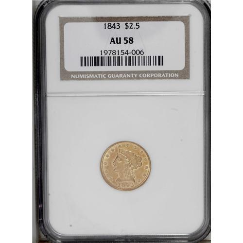 <B>1843<$2 1/2> AU58 NGC.</B></I> Stunning for the grade with vibrant orange-gold patina over much of the surfaces. No offensive marks are present and the strike is pleasing. Infrequently seen near Mint State, and as such worthy of a premium bid. Census: 38 in 58, 16 finer (8/06).