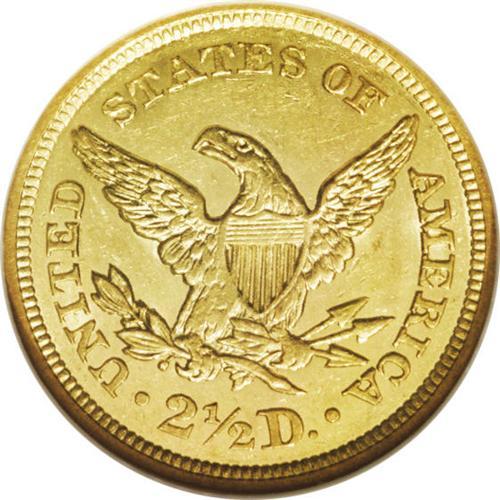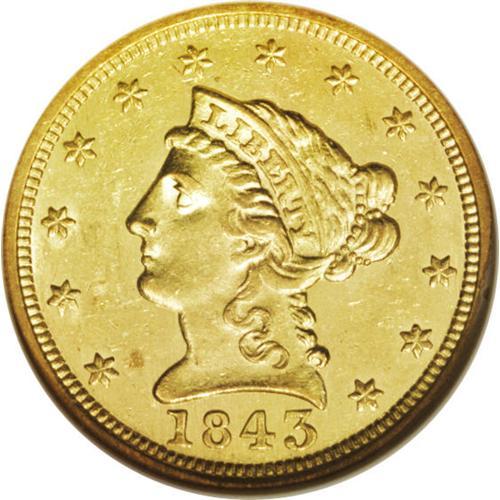 <B>1843<$2 1/2> MS61 NGC.</B></I> Fully lustrous and sharply defined with reflective green-gold surfaces. Deeper orange-gold color is evident on both rims, and a few coppery toning spots are barely visible in the fields. Although a lower Mint State grade, this is an extremely important opportunity. Census: 7 in 61, 9 finer (8/06).