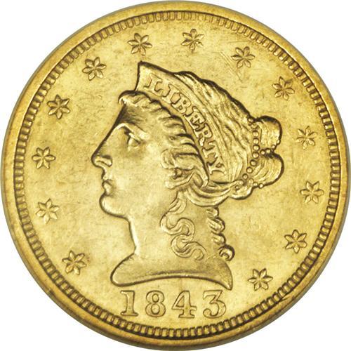 1843 $2 1/2 MS61 NGC. Scarcer than its mintage of 100,