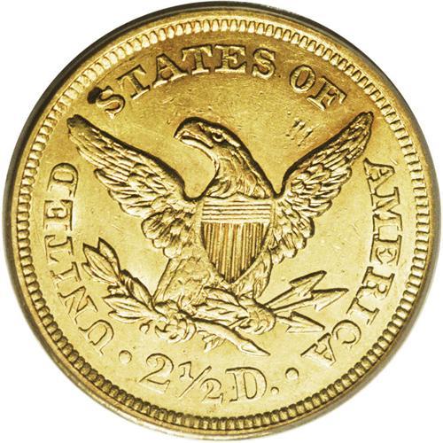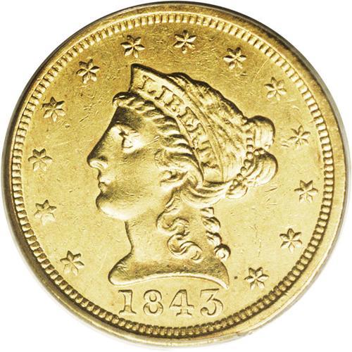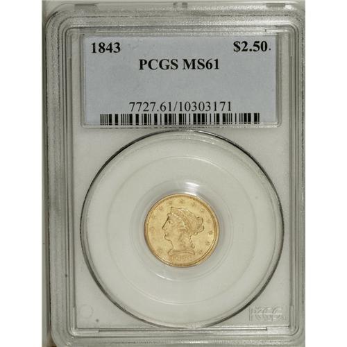 <B>1843<$2 1/2> MS61 PCGS.</B></I> By modern standards, the mintage of 100,546 coins seems modest, although this was a substantial quantity in 1843. Circulated examples of this date are rather common, but Mint State examples are surprisingly scarce. This piece has satiny light gold color and fully luster. A few faint surface marks are consistent with the grade. Population: 2 in 61, 6 finer (8/06).<BR><I>From The Della Collection.</B></I>