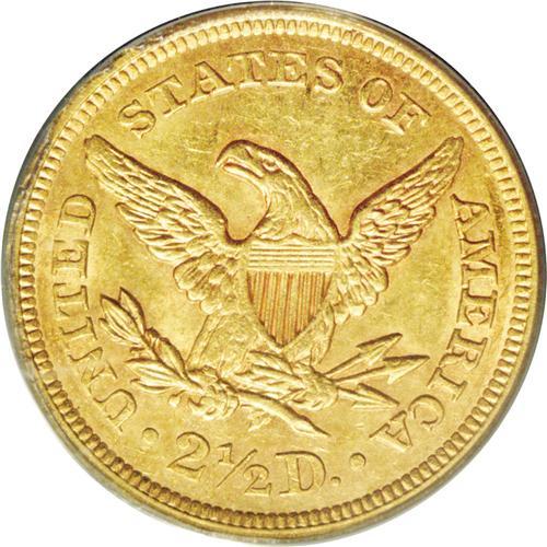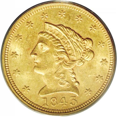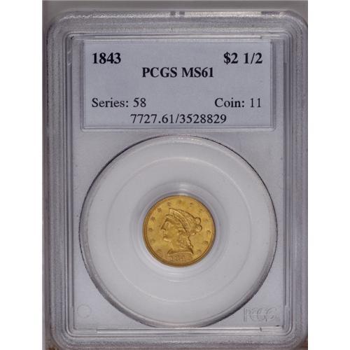 <B>1843 $2 1/2 MS61 PCGS.</B></I> Lustrous in the fields and attractive for the copper-gold toning on both sides. Moderate abrasions are present, including a hairline below Liberty's eye. An average strike with slight softness on the eagle's thigh, but the stars and curls are full on the obverse. Population: 2 in 61, 5 finer (1/06).