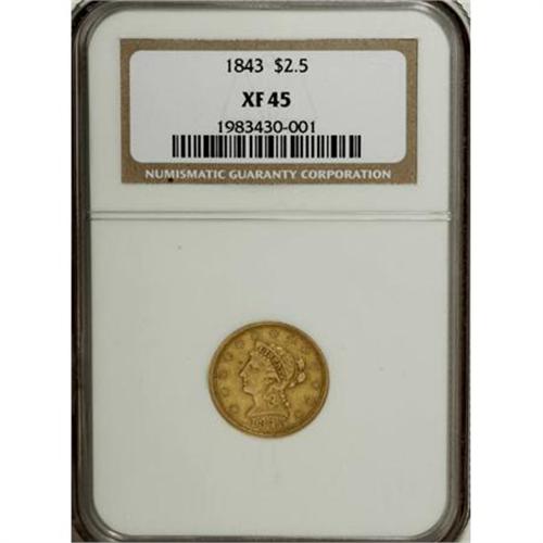 <B>1843 $2 1/2 XF45 NGC.</B></I> NGC Census: (10/121). PCGS Population (11/30). Mintage: 100,546. Numismedia Wsl. Price for NGC/PCGS coin in XF45: $272. (#7727)<BR><BR><B>Coin Engraver:</B> Christian Gobrecht<BR><BR><b>Shipping:</b> Coins & Currency (<a target="_blank" href="http://www.heritageauctions.com/common/shipping.php">view shipping information</a>)