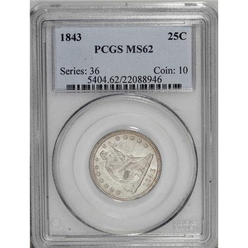 <B>1843<25C> MS62 PCGS.</B></I> Light golden patina settles over both sides of this lustrous piece. Marks and a luster scrape in the right obverse field account for the grade. Population: 7 in 62, 18 finer (8/06).