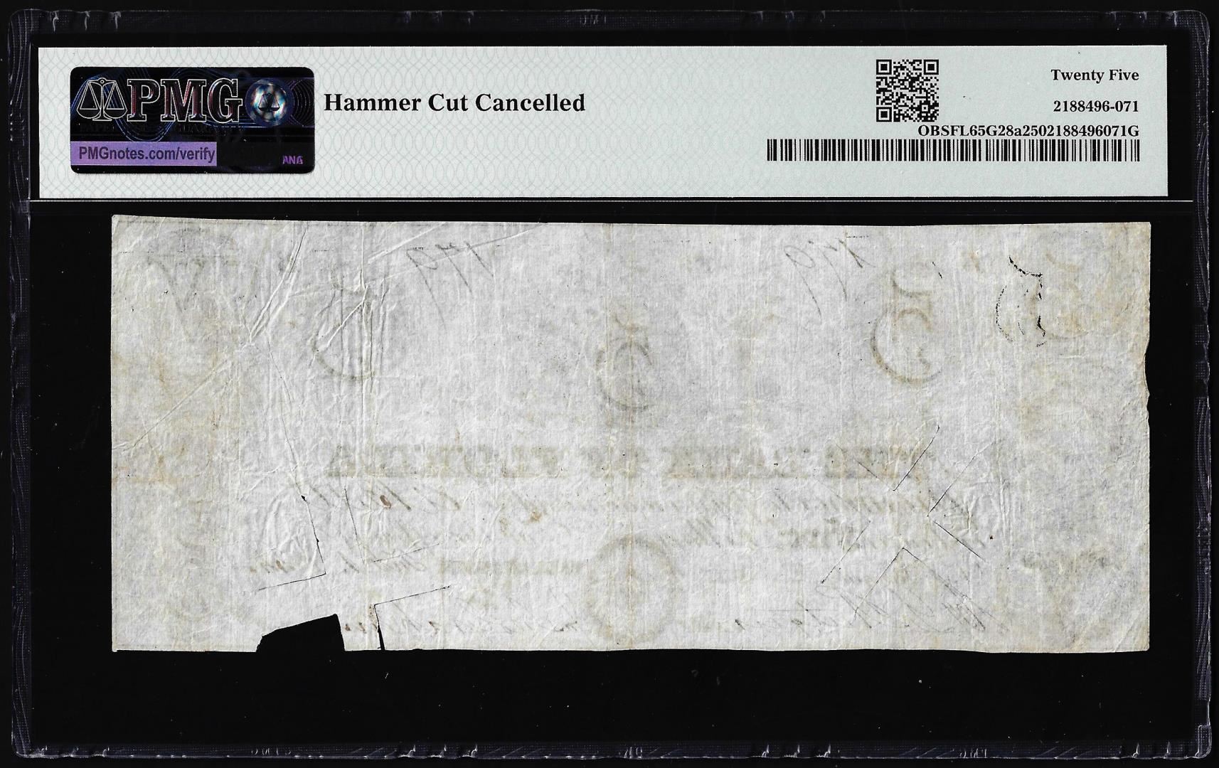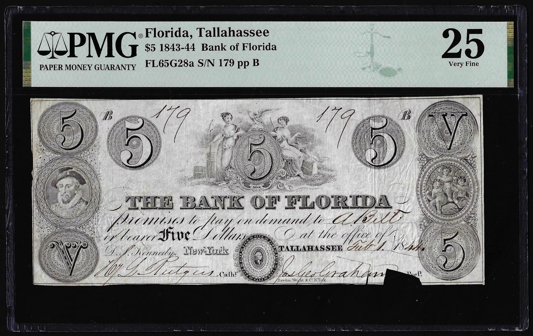 One 1843-44 $5 The Bank of Florida Tallahassee, FL Obsolete Note PMG Very Fine 25. PMG Certified.