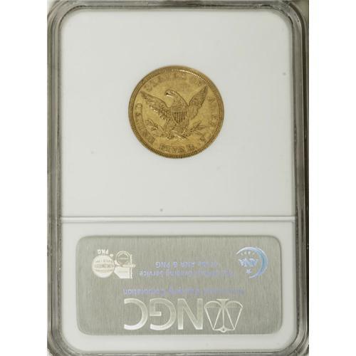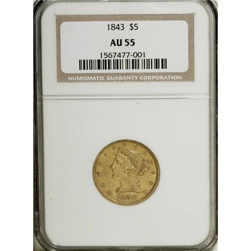 <B>1843 $5 AU55 NGC.</B></I> Rich apricot-gold patination imbued with hints of red covers both sides of this Choice AU specimen. All of the design features are well delineated, and traces of luster are visible in the protected areas. A few inoffensive light marks are scattered about.<BR><BR><b>Shipping:</b> Coins & Currency (<a target="_blank" href="http://www.heritageauctions.com/common/shipping.php">view shipping information</a>)