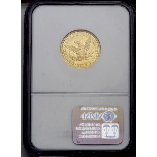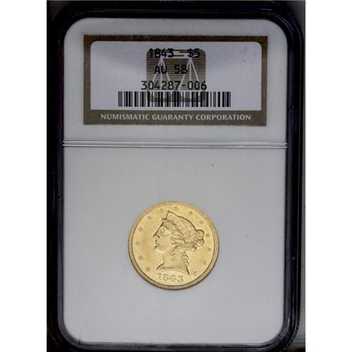 <B>1843<$5> AU58 NGC.</B></I> Noticeable remaining luster with a sharp strike and moderate abrasions. Among the more readily available Half Eagles from the 1840s, the '43-P remains elusive in grades approaching Mint State.